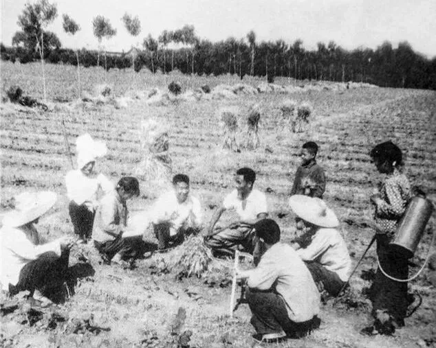 知识青年在地里和社员们一起收割粮食,休息的时候聚在一起讲着什么,还有个女孩在认真的记录着什么,这就是那个年代的集体精神吧。