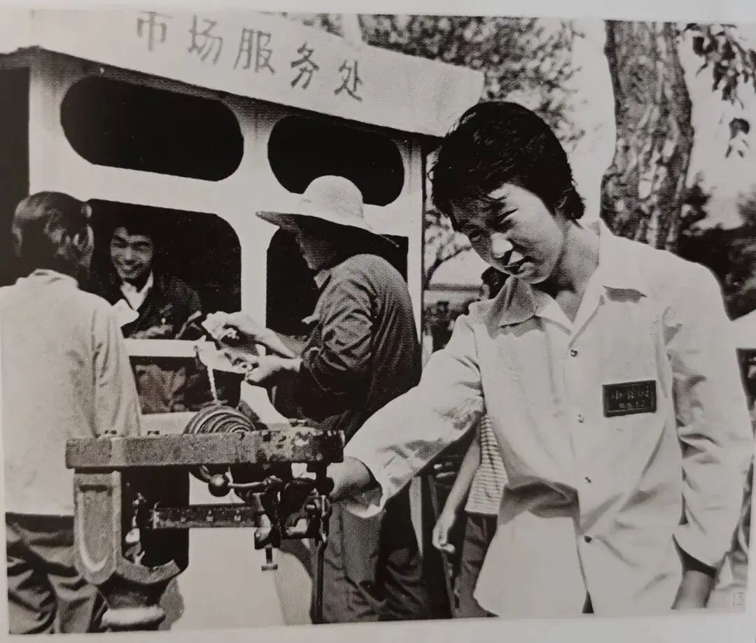 80 年代的农贸市场上,一位女市场监督管理员穿着统一的白色工作服,正在仔细检查小商贩的秤,确保交易公平。