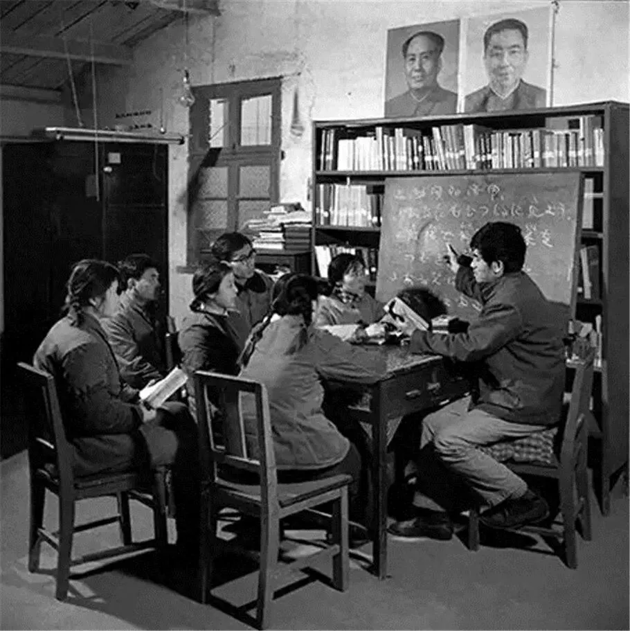 1980年,学日语教室里,孩子们围坐在老师身边学习日语,墙上贴着毛主席和华主席的画像。