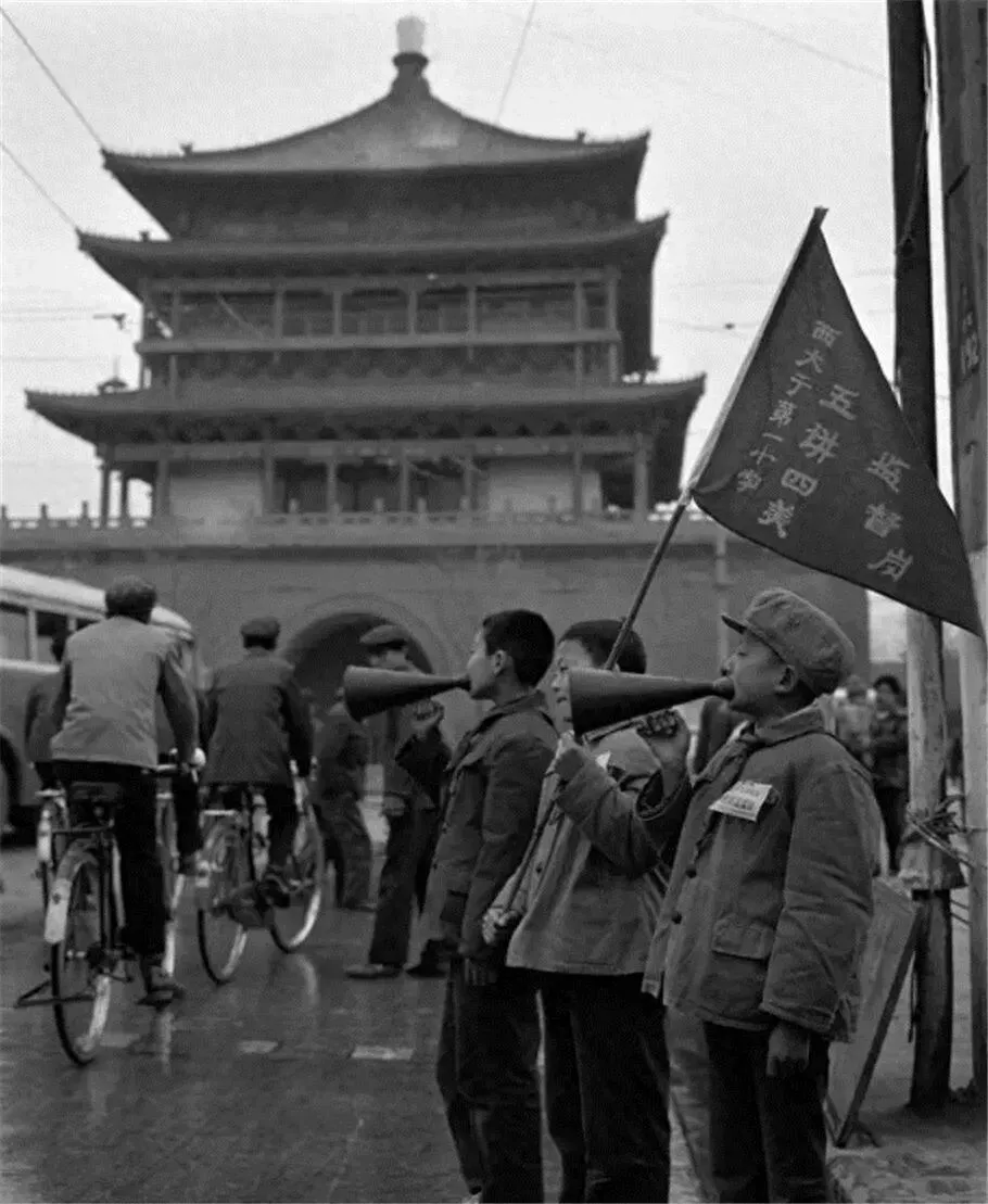 1981年,小学生参加监督岗,指挥交通。1981 年,小学生们参与交通监督岗活动。他们手里拿着小喇叭和小旗,在人来人往的路口指挥交通,旗帜上写着 “五讲四美”。