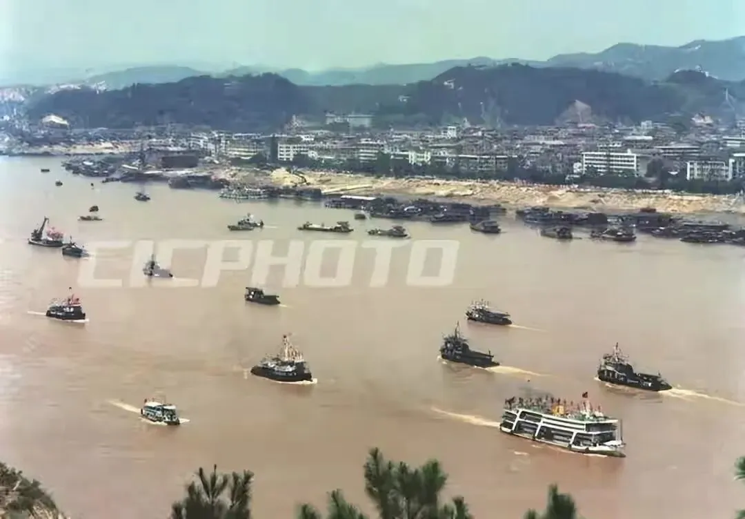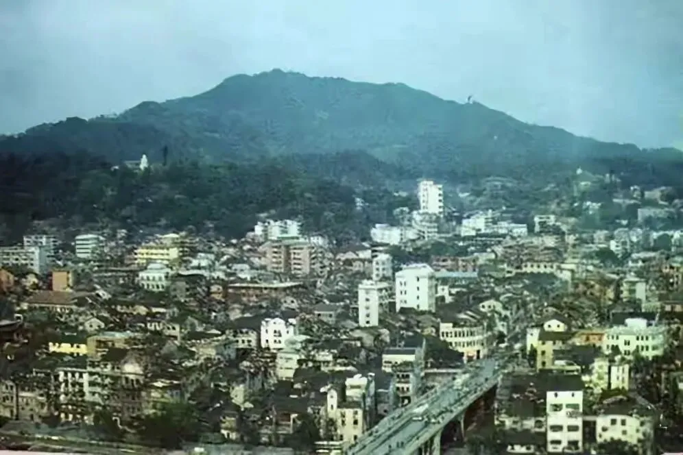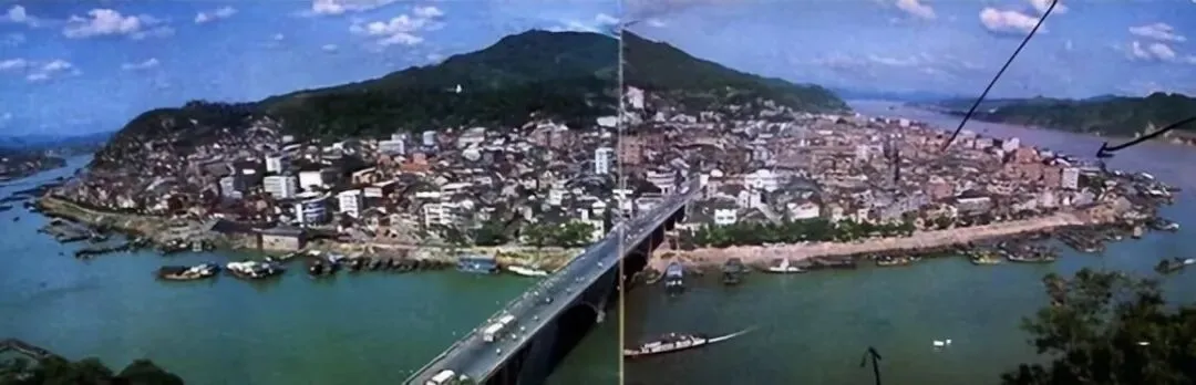 八十年代的梧州全景照,城内房屋密集,大多是低楼层房屋,高楼大厦很少见。三面环水,江上有不少的船,远处是山峰,青山绿水的,环境不错。