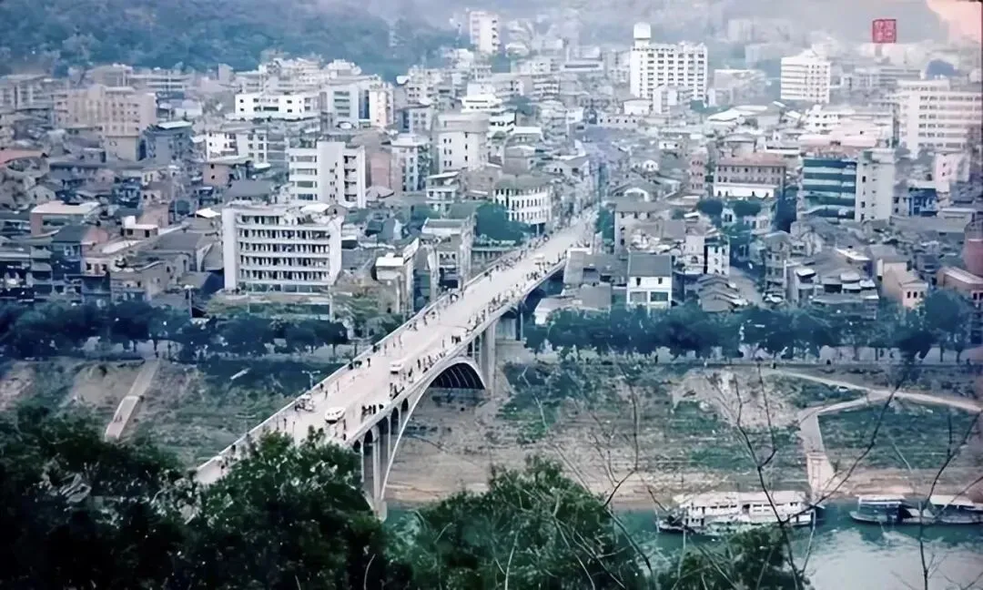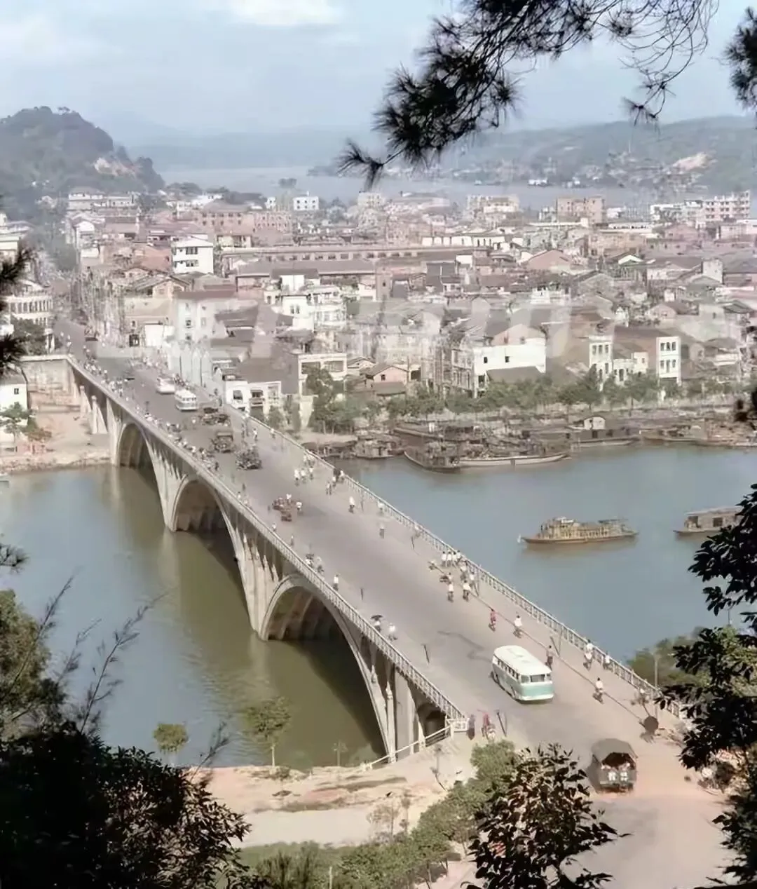 70年代的桂江大桥,桥上不少人骑着自行车过桥,那时汽车很少,但也有几辆在跑。桥的那边房屋密密麻麻,大多是三四层高的楼房,特别高的很少见。桥下有船正在通过,岸边也停着不少的船。
