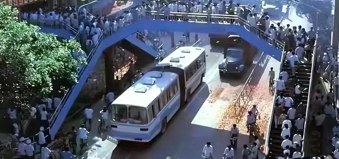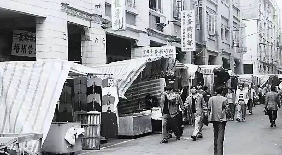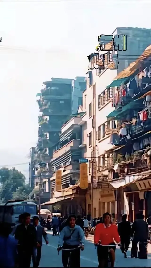 这里是大南路,街道两旁是高楼,街上有不少人,有的走路,有的骑自行车,还有一辆巴士,那时候巴士很少见。