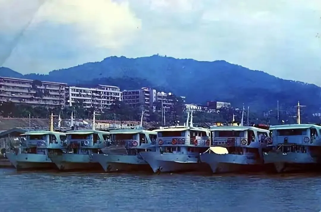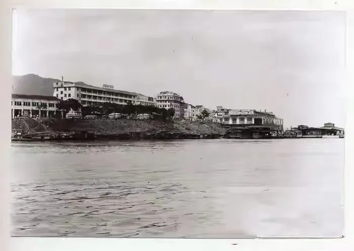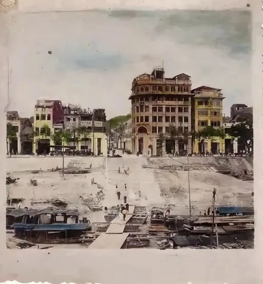 这是60年代的大南路码头,码头边停着一些船,岸上的高楼十分醒目。大南路码头是梧州最大的码头。