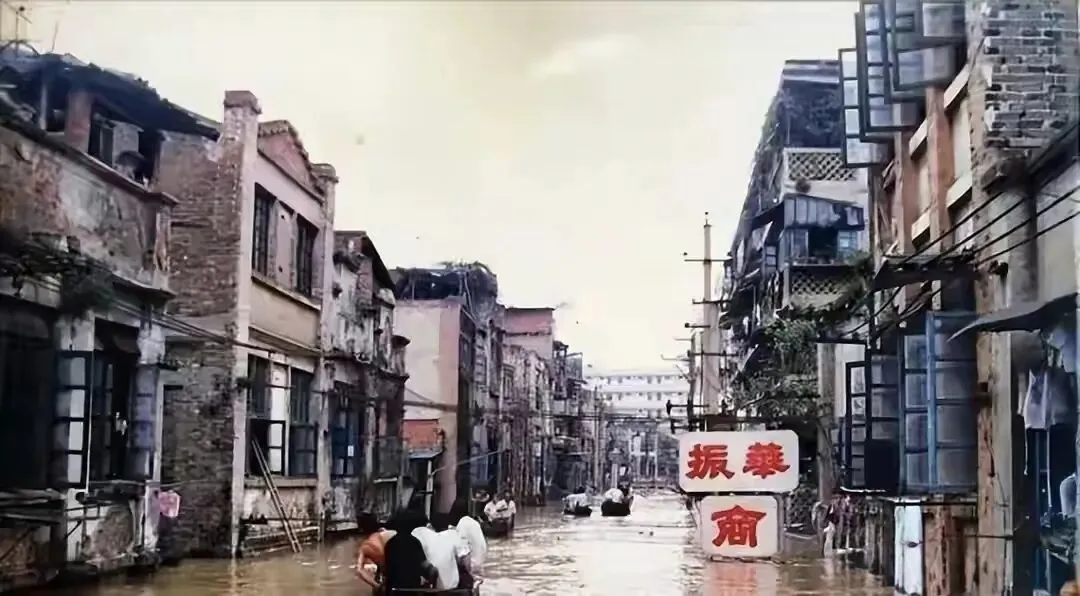 1988年的大东路,一场洪水把街道都淹没了,水很深,人们出行靠小船。街道两边的房子有点旧了。