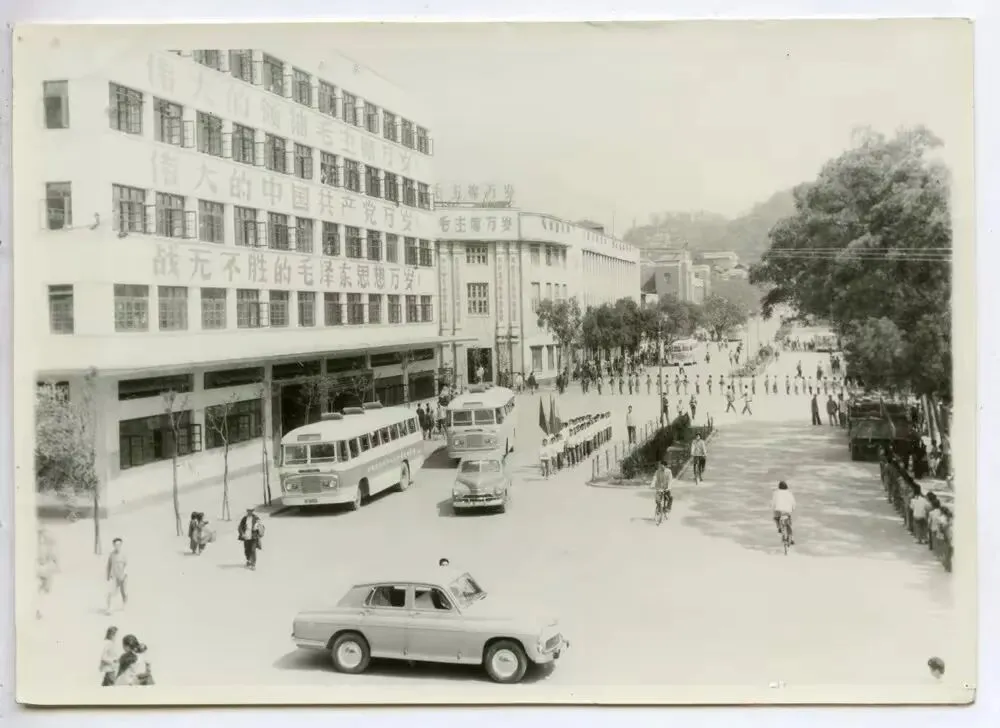 70年代的中山路,宽阔的马路上,有几辆大巴车,也有小汽车,车辆比较少,人民出行主要靠自行车。马路上不知道是不是有学生在举办什么活动,排着队过马路。