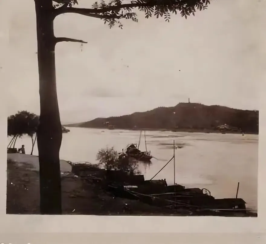 1972年的鸳江码头,宽阔的江面不见有船,远处的岸边有不少的高楼。
