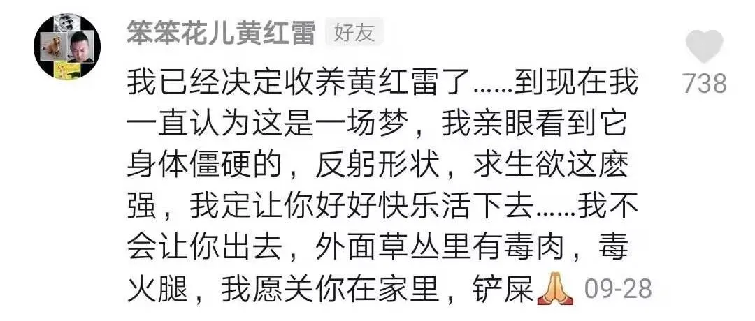 随着关系的亲近,小花早已经把他当成了朋友,它将自己的流浪狗伙伴,一只黄色的小狗介绍给他认识。这只黄色的小狗,网友给它取名为“黄红雷”(emmm这个名字孙红雷同意了嘛?)。因为店铺房东不同意,而且小花也接受不了家居生活 ,它不敢进门,就算强迫它进了门,它也会恐惧狂叫,没办法,网友只能作罢。虽然小花没有固定住所,但是它有人照顾,好朋友黄红雷也陪着它,生活也算不错。但是,平静美好的生活很快被打乱了,在这个小县城里,有很多对狗狗不友好的人,小花就差点被坏人套走了。但是,这次经历把小花吓坏了,它变得很胆小,甚至不敢离开他的店门口。小花变得更加依赖网友,它开始慢慢改变,学着进屋,学着克服被关在屋里的恐惧。而就在小花成长的同时,一个好消息也传来了,在网友的努力下,房东终于同意让小花入住啦!好朋友有了家,狗狗黄红雷也觉得很高兴,它有时也会进来店里,好像是来确认小花过的好不好。看着黄红雷这么贴心,肯定很多小伙伴想问问它怎么样了。毕竟,就算它有人喂,但是一直在外面流浪,总归是不安全的。然而,就在网友在为黄红雷找领养的期间,它也发生了意外……他心里一紧,赶忙跑出去看,然后发现黄红雷被坏人投毒还绑住了嘴巴!它当时的样子把网友吓坏了,失禁,全身抽搐,呼吸微弱,看起来格外痛苦。因为大半夜附近医院都关了门,网友快急哭了,他和店里的理发师不停的对它进行急救,但是却没有什么起色。早上6点,黄红雷突然好转,甚至在它清醒后,精神也不错!经历了这场投毒事件,网友啥领养人也不找了,因为他决定:自己收养黄红雷!美好的故事,似乎要在这里画上了句号,但是,还没有结束哦!就在前几天,网友翻看手机视频的时候,忽然发现,他和小花竟然很早就见过面!那时他带着笨笨玩,而小花正好充当背景板从后面走过。而黄红雷呢?一直紧跟花总的步伐不动摇,直到一步步走进网友的家。估计那时候,谁都没想到,这两只狗狗会成为网友和笨笨的家人吧!感谢你们给我们带来这么暖的故事,祝你们一家永远幸福!【免责声明】文字、图片等素材来源网络,如侵立删