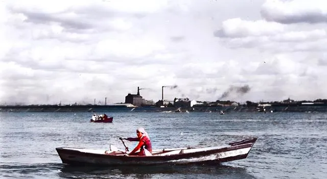 这个单人木划子靠一支桨吃饭,船帮刷过白漆,露出木纹的地方被水磨得发亮,江面风一吹,衣袂被鼓起,岸线上烟囱吐着黑烟,爷爷说冬天冻得梆硬,夏天水面宽得像天一样长,划起来顺得很。