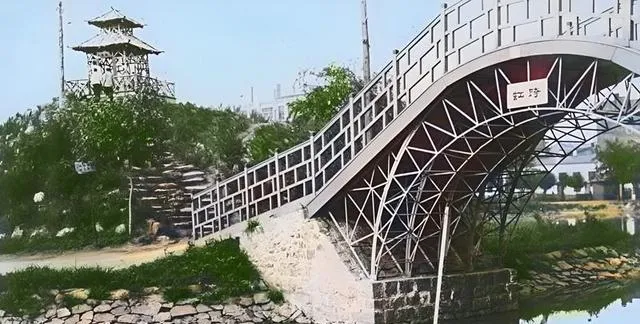 拱桥肚子大,桥肋像梳子齿,一节节咬住石墩,桥额牌写着名字,边上是假山和一段石阶,小时候我追着哥哥上去跑,脚底板贴着铁板有点烫,桥下水清,能照见桥背的弧线。