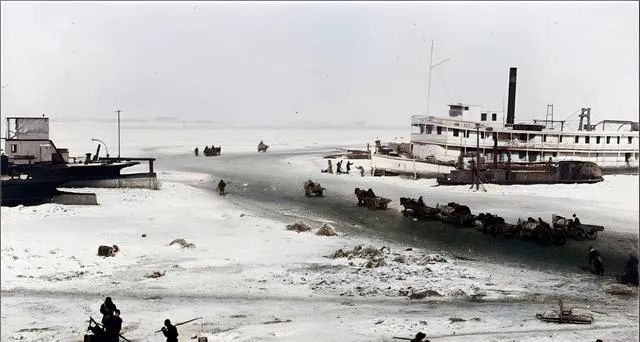 这幅最硬气,江面冻成了路,马车拖着货物嘎吱往前,靠岸停着大轮船,像被人按了暂停键,男人们挑着杆子探冰眼,走得谨慎又利索,那时候没有多少取暖法子,能从江上抄近路就省一天的工夫。