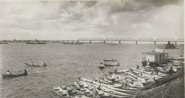 这条铁桥横在远处,桥洞一个接一个,像把钢梳子插在江里,近岸是小划子,孩子们坐在船沿拍水,风把水面揉得皱皱巴巴的,现在游船讲究娱乐项目,那时候坐船就是走路的延长。