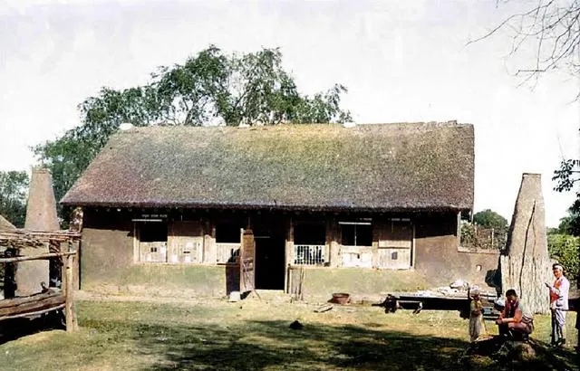 这个屋顶压着厚厚的草,墙体是土坯抹灰,门口吊着柴禾和半截锹把,男人喂着鸡,脚边一只牛探头往前凑,屋檐下立着篱笆,都是柳条编的,结实耐用,奶奶说有篱笆就有家,能挡风也能拦鸡鸭。