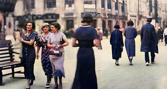 这几位穿着贴身的裙子,帽檐压得低低的,手里拎着包,步子迈得稳,街边长椅上总有人歇脚,橱窗里摆着进口货,爸爸笑我,别看热闹,真正的看头在招牌,用字大,用料实,招呼人不费劲。