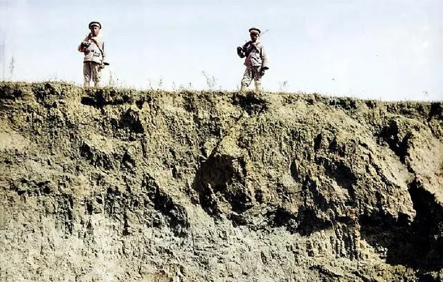 两个人站在坡沿,枪背在肩上,阳光把影子拉得细长,脚下是被风刮出的沟壑,这场景像是对着荒地打量,自个儿也不知道下一步该往哪走,爷爷说那时候心不敢大,带着兵器才踏实。