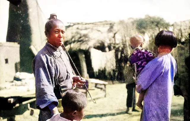 这根烟袋杆长,嘴里叼着,手背青筋起,怀里的孩子盯着看,旁边几个娃绕着她转圈,院里散着晒谷子的香味,日子不紧不慢的样子,在烟雾里飘。