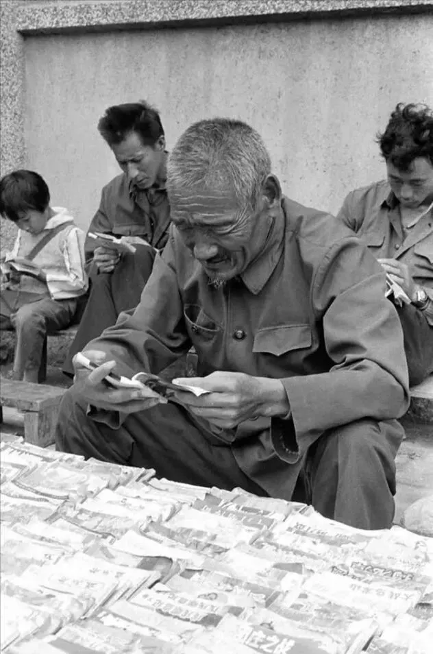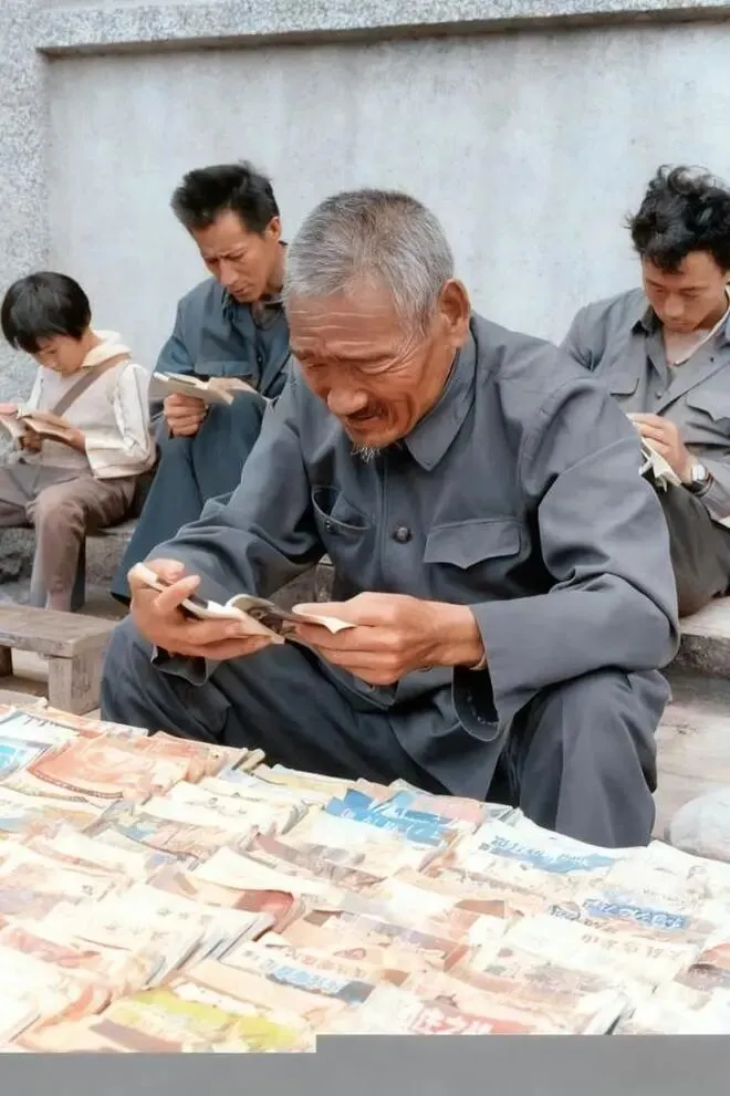 最靠前的老人头发花白,身着深灰色中山装,枯瘦的手指小心捏着书页,眉眼弯成一道缝,全然沉浸在书中情节里;身后,两个中年人也各自捧着小人书,工装布面带着生活的质朴纹理,目光紧紧锁在纸页上;更左侧,一个孩子挎着书包,穿着带浅色边饰的上衣,小小的身子蜷在长凳上,同样专注地盯着手里的小人书,仿佛已钻进故事的世界。