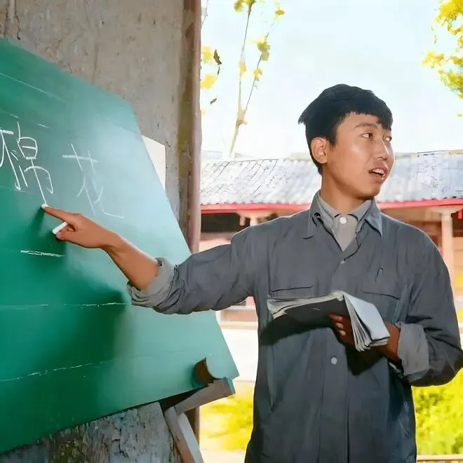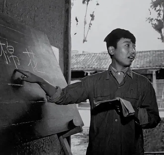 1958年的四川仁寿县乡村,一位年轻的扫盲教师正专注地开展教学。他身着深灰色的工装,领口露出浅淡的衬衣领,袖口随意挽起,透着朴实的干练。左手攥着一沓纸张(似识字讲义或课本),右手稳稳指向黑板上用白粉笔书写的“棉花”二字,神情投入,仿佛正耐心讲解着文字的模样与含义。