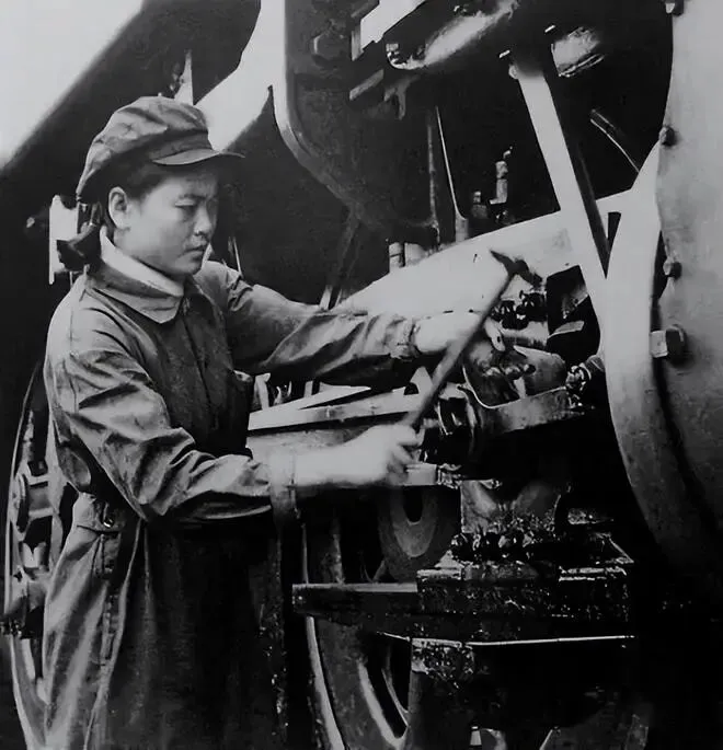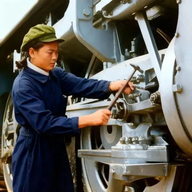 1950年的辽宁省,新中国第一位火车女司机田桂英正专注于蒸汽机车的操作与检修。她身着工装,头戴工作帽,工装布料质朴却透着利落干练。双手紧握工具,神情专注而坚毅,目光落在庞大的机车机械部件上——蒸汽机车的金属构件泛着冷硬光泽,齿轮、连杆等结构复杂精密,尽显工业机械的厚重力量感。