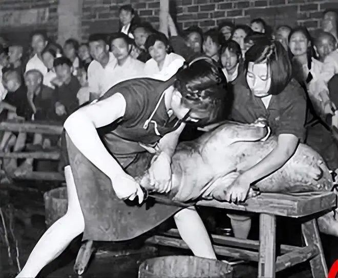 人民公社时期的集体场院里,被层层围观群众挤满。一位女子外系围裙,正动作娴熟地在长木凳上处置一头肥硕的猪;身旁另一位女性合力按住猪身,二百来斤的肥猪在二人手下被稳稳掌控。女子手法利落,仿佛对杀猪工序烂熟于心,全然不见局促。
