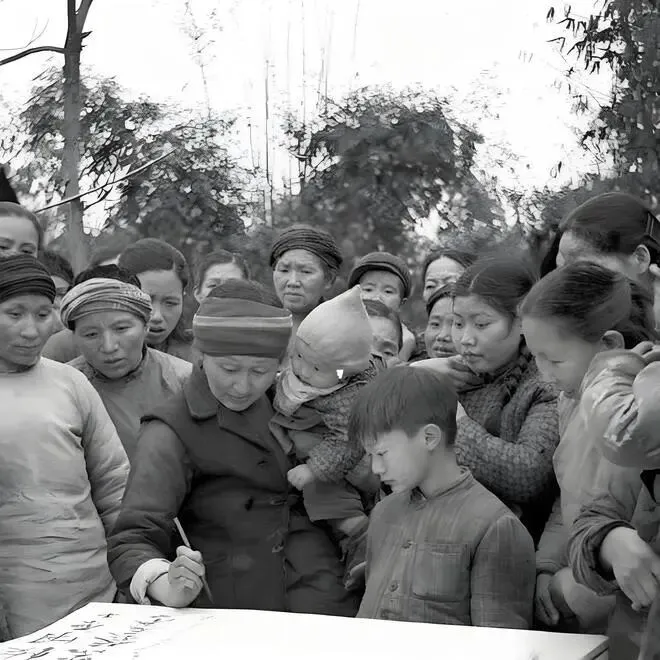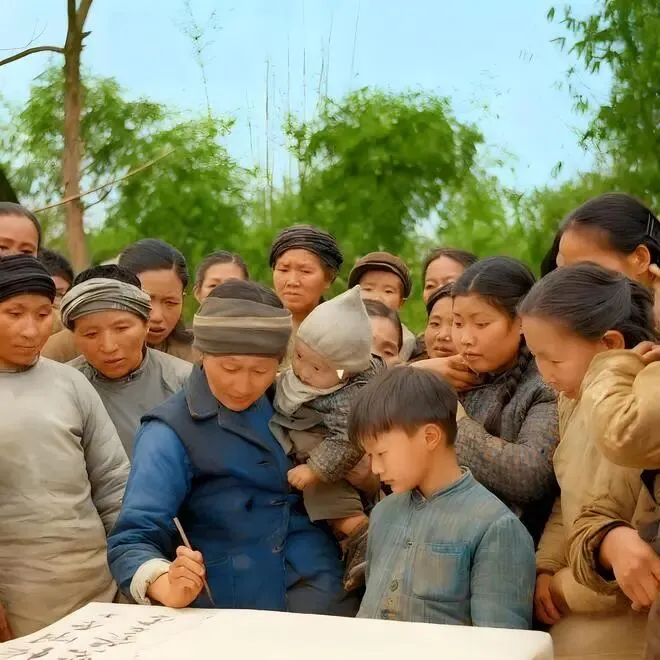 她们穿着粗布缝制的朴素衣裳,样式带着鲜明的时代印记;有的怀抱着孩子,孩子睁着懵懂的眼睛,好奇地望向纸面;有的正专注地握笔,在文告上郑重落下名字,指尖仿佛凝着对和平的恳切期盼。