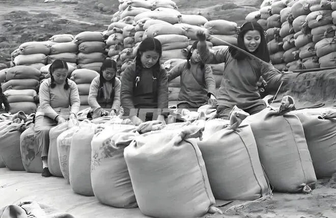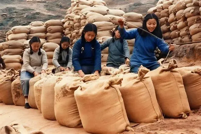 1953年,四川省长寿县的几位妇女围在巨大的粮袋边,正专注地为装好的粮食缝口,有的衣袖挽至小臂,手指灵巧地捏着针线,在厚实的麻袋布面上来回穿引,将袋口仔细收束;有的低头凝视针线,手腕轻转间,结结实实的针脚便沿着袋口次第排布。码头旁,浅褐色的粮袋堆叠如小山,粗糙的麻袋纹理在光线里漾着朴实的质感。