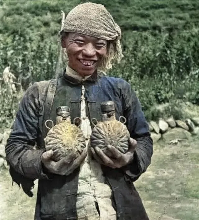 那个袋子是做迫击炮弹用的。 这么点大的孩子啊......