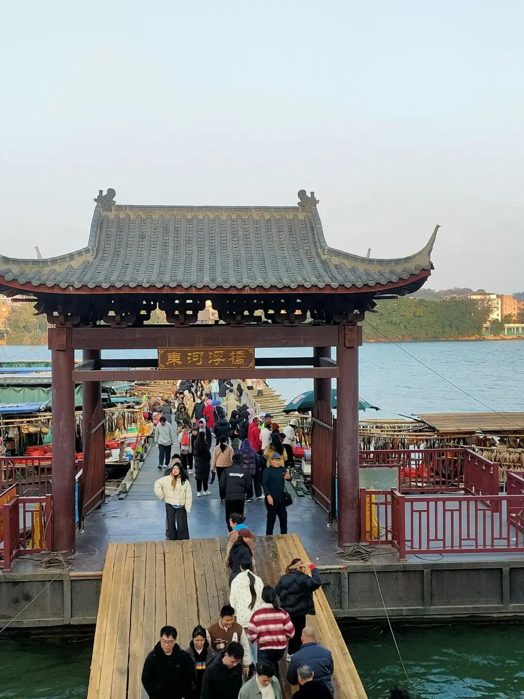 现在的东河浮桥已经焕然一新。承重的舟船船体更大,桥面更宽,完全笔直。靠城区建春门这头也建了个大门。桥头两边有很多卖鱼的船,船主在极力向游客兜售水产品。岸上建春门门口也都热闹非凡。