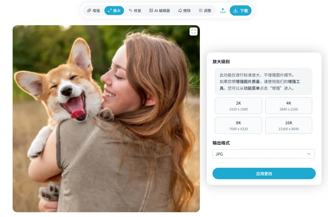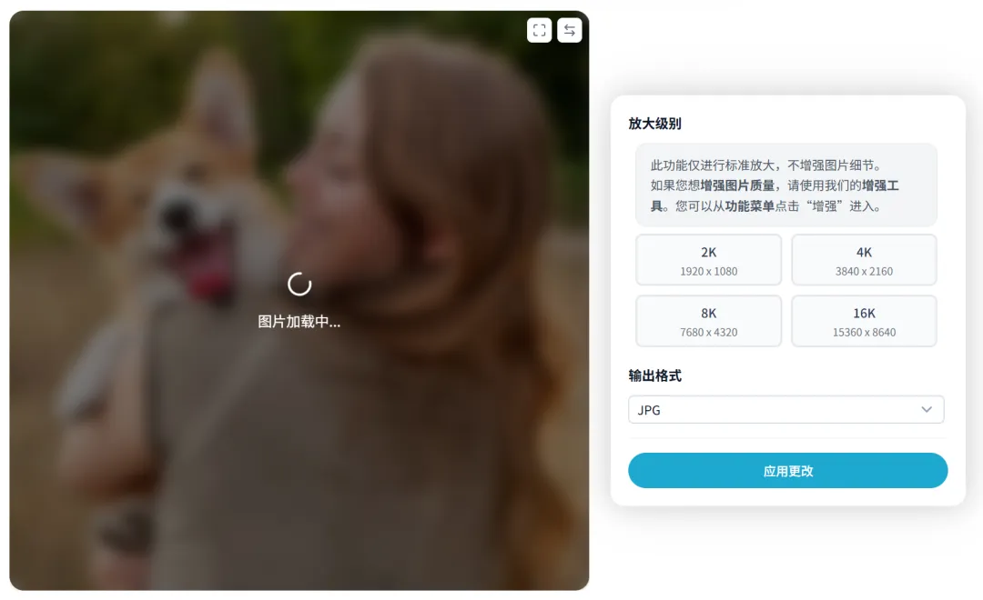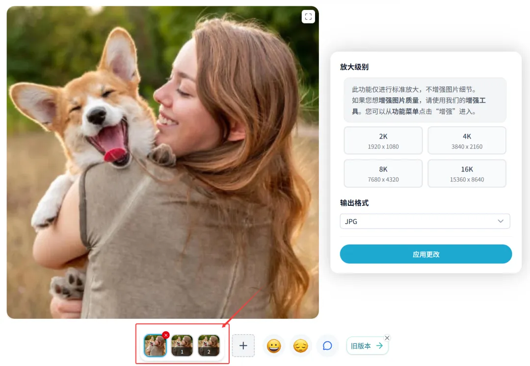 我们上传照片,在上面导航选择「放大」,然后再右侧选择你需要放大的级别,默认支持最大到16K,以及选择输出格式,有包括JPG、WebP、PNG三种。