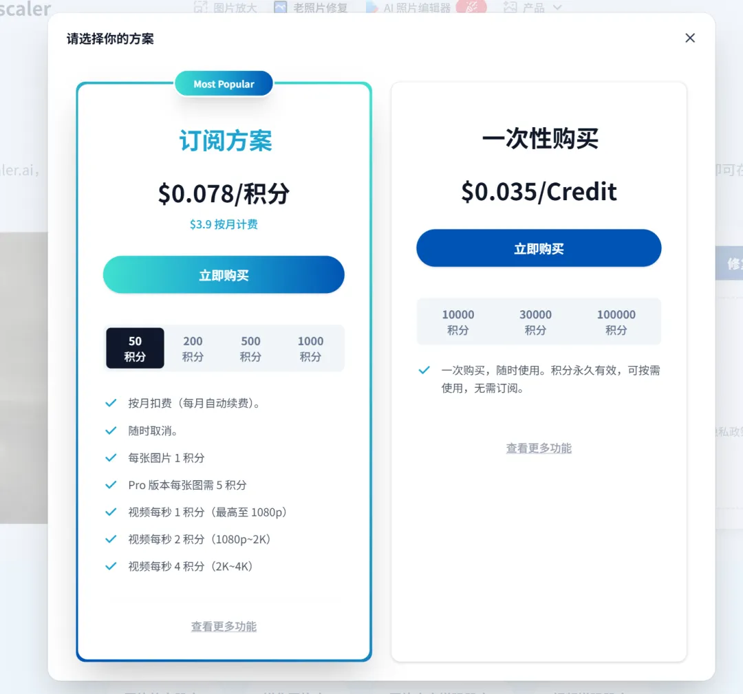 当然ImgUpscaler平台工具有一定的免费额度,如果你需要量大的话需要购买消耗积分,毕竟平台也是需要模型接口成本和运营成本的。前几天老蒋还看到有一篇文章,有提到有一些聪明的网友,在某些鱼平台,提供修复老照片服务,每张5-10元,当然他们也是用工具修复的,如果我们也有兴趣,也可以用此方法去抢生意。