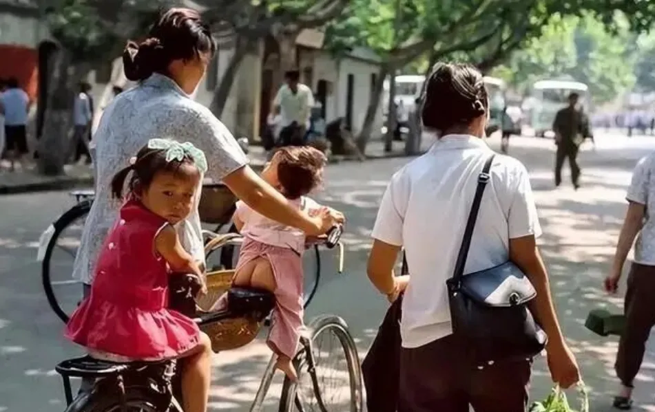 第1张(骑车带孩子的女性):80 年代左右的城市街道,绿树成荫,女性用凤凰牌自行车带两个孩子,一个在梁上,一个在后座。