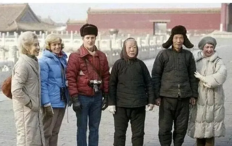 第2张(故宫前的中外游客):80 年代改革开放初期,外国游客开始来华,和中国本地老人合影。中外衣着风格对比明显:外国人的羽绒服、冲锋衣,中国老人的棉袄、棉帽、雷锋帽。
