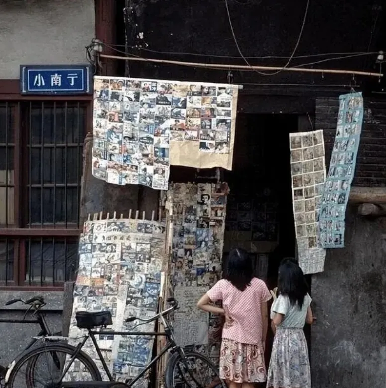 第4张(小南丁胡同的小书摊):胡同里的小书摊,挂满了各类小照片,两个女孩驻足观看。小时候最爱的地方 , 几分钱租一本连环画 , 蹲在摊边看一下午 , 天黑了都不想走。