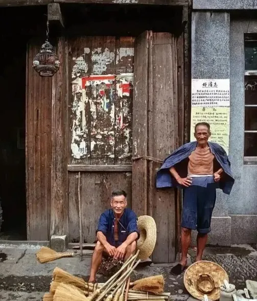 第5张(老巷子里的手艺人):老巷里两位穿着 粗布衫的老人,在街边摆摊 , 一个卖笤帚 , 一个卖散装旱烟。