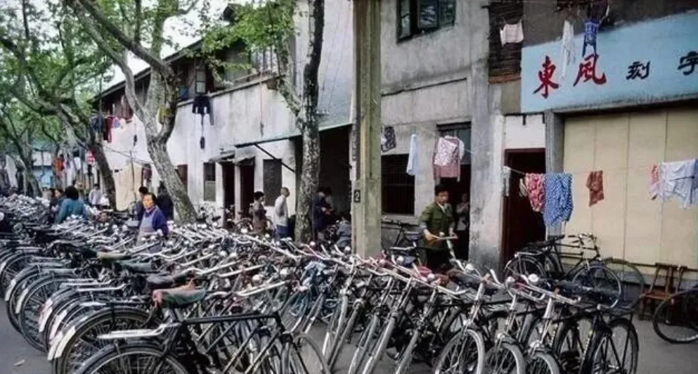 第6张(弄堂里的自行车长龙):西湖边电影院门口,自行车停车费只要2分钱。这个弄堂里,成百辆自行车整齐停放,墙面斑驳,晾着衣服,“东风刻字” 的招牌充满时代印记。