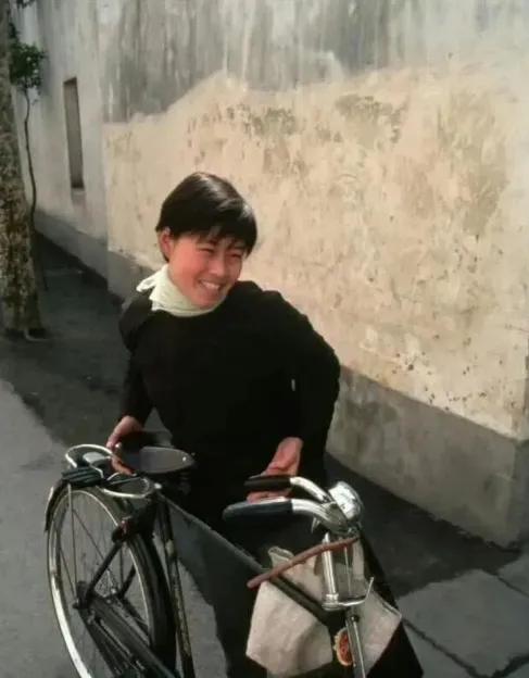 第8张(弄堂里骑车的女性):这条窄巷子里,一位女性骑 “二八杠” 自行车,朴素的黑衣、白围脖,斑驳的老墙。自行车是当时通勤、买菜的出行工具。这自行车当时要180块,普通工人月薪才三四十块,得省吃俭用攒小半年才能买下。