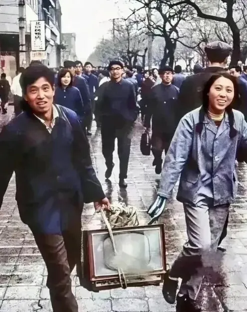 第10张(搬电视机的夫妻):武汉一对夫妻正小心翼翼搬着一台黑白电视,脸上的笑意藏都藏不住。这尺寸放到现在,还没平板屏幕大,在1981年,能买得起一台,好比现在家里买了辆好车,喜悦直接拉满。
