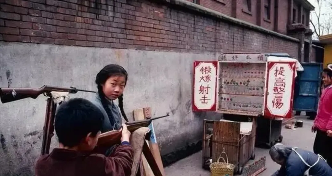 第11张:街头打枪的游戏摊,女孩看摊,男孩举枪,背景标语 “锻炼射击 提高警惕”。