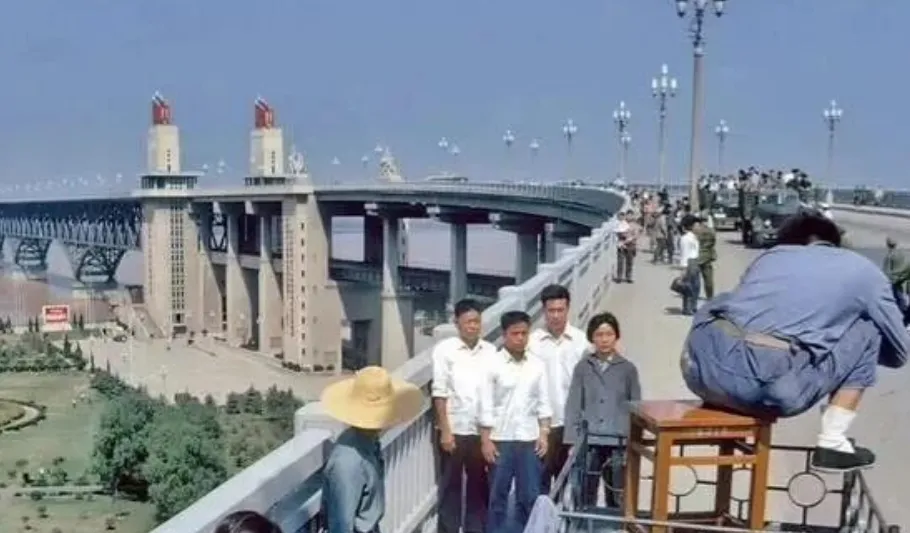 第12张:南京长江大桥,桥上有游客拍照,还有人站在凳子上拍。
