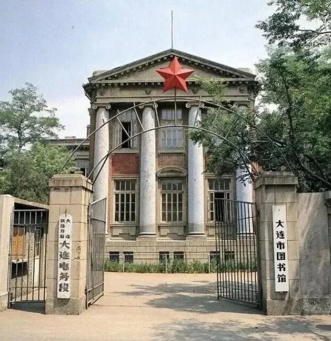 第13张:大连市图书馆,建筑门口有 “大连市图书馆” 和 “大连湾坞段” 的牌子,屋顶有红星。
