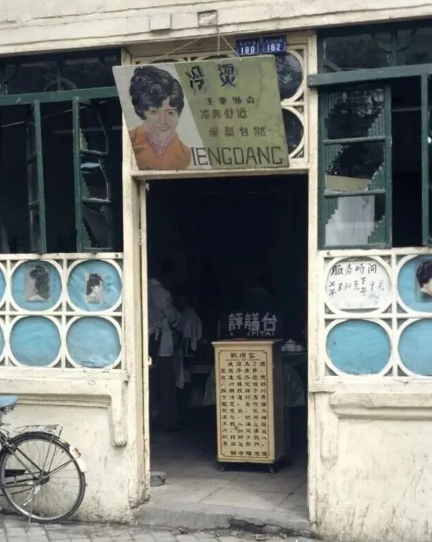 第14张:街头烫发店,招牌有 “冷烫” 和拼音 “IENGDANG”(错),还有时髦的女性头像,门口有服务时间牌,自行车停在旁边。