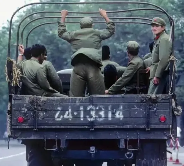 第15张:军绿色卡车拉着穿军装的人,大家的着装是 60-70 年代的军绿色。