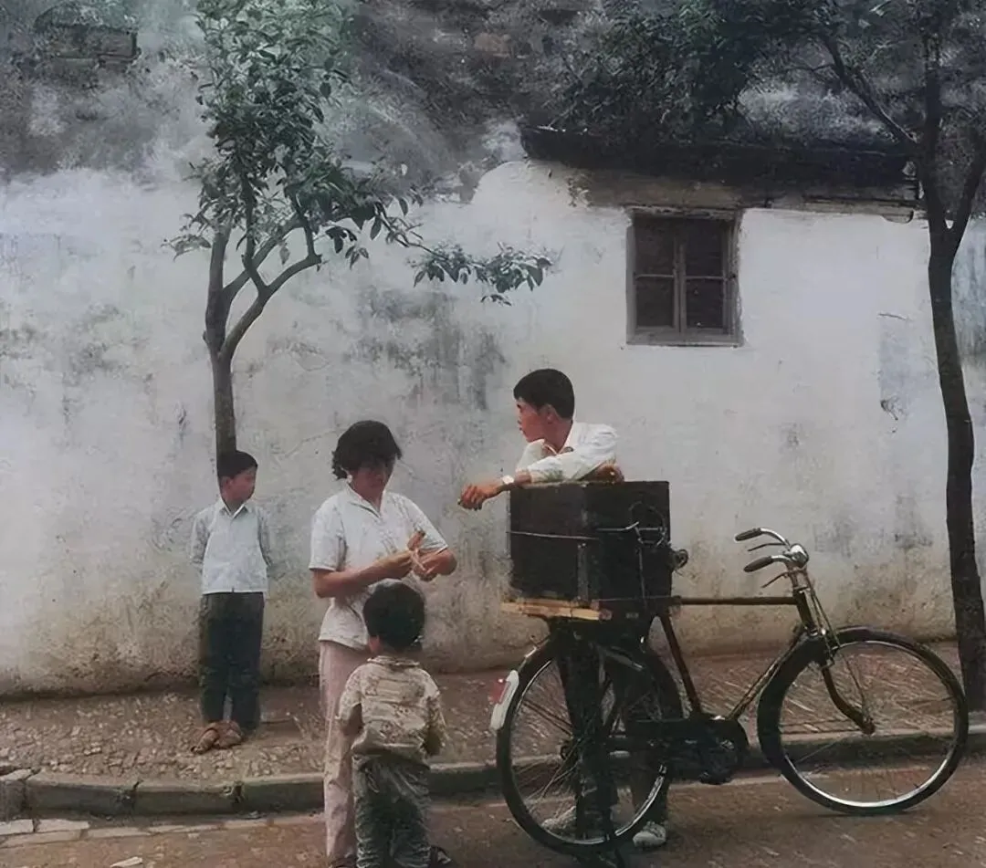 照片中是一位骑着“二八大杠”的卖冰棍的师傅。一位妈妈给孩子买了一根冰棍正低头掏钱。还有个稍大些的男孩,靠在后面的树上,望着远处。或许他是在等妈妈过来,也给自己买一根吧。