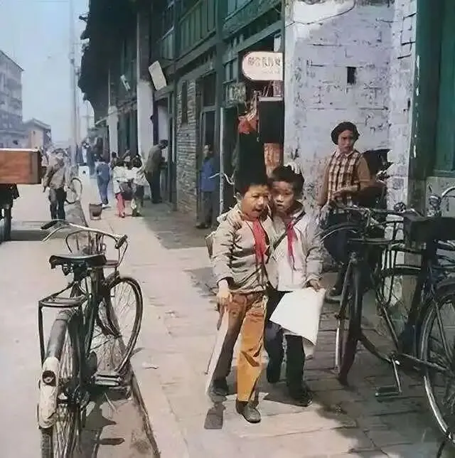 照片中,两个系着红领巾的小男孩勾肩搭背地走在路上,一个手里攥着刚发的卷子,另一只摸着他的头,两人也不知道说着什么。大概是刚放学,正急着去商店买一包无花果丝。