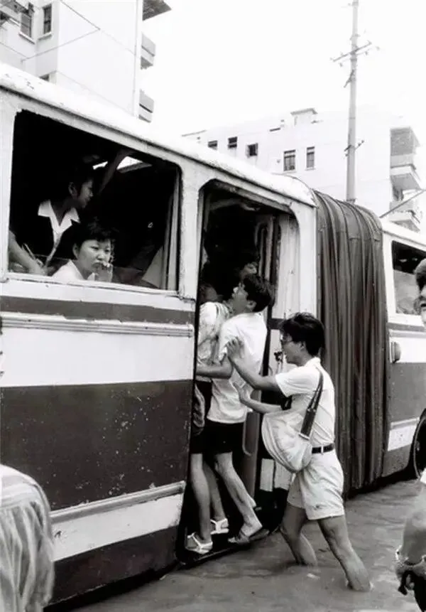 这张黑白照片,把我们拉回了90年代挤公交的场景。照片里是当时最常见的铰接式公交车,中间的帆布软篷可以伸缩。