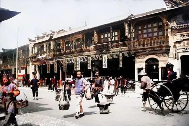 河对岸疑似小码头,停泊着数艘货船,沿岸则建有中西合璧的建筑。南京路——这条历经百年沧桑的繁华街道,见证了上海从昔日的海派风情到今天的现代化繁华。当年,街道宽阔,两旁矗立着传统的中式两层楼建筑,商铺门前悬挂着五彩斑斓的广告旗子,街道上人潮涌动,小贩挑担叫卖,黄包车穿梭其中,呈现出浓厚的市井气息。