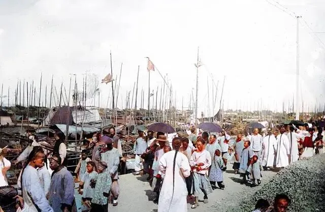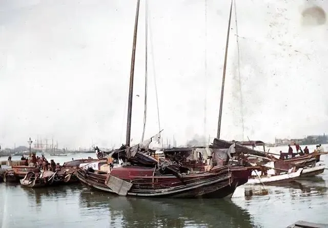 照片中,一群乘客正在踏上客船,而在近处的帆船上,船工们已经将帆收起,而船竿上则晾晒着他们的衣物。