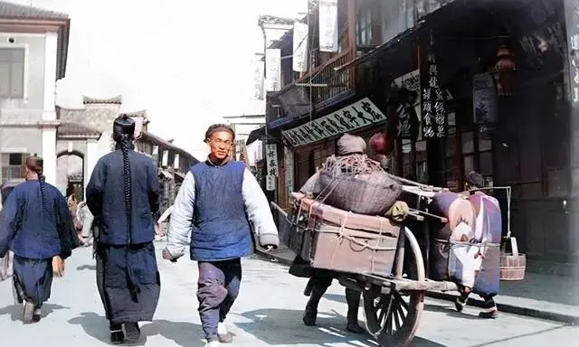 道路两侧,中式建筑与欧式小楼交相辉映,形成了一幅别具一格的画卷。照片中,一位男子正在雇佣独轮车,让车夫将他的货物送到目的地,这一幕更是展现了当时人们的生活场景。
