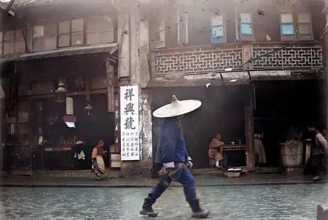 在雨中,一个戴着斗笠的男子匆忙走过街头,身后是一块招牌,上面写着“祥兴号”。紧邻的还有一家小吃店,仿佛在为他的匆匆路途增添一丝温馨的气息。