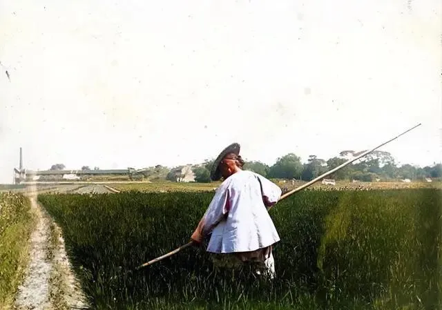 在郁郁葱葱的稻田里,一位戴着草帽的女子正在辛勤工作。她握着一把长柄锄头,专心致志地清理田中的杂草。远处,一座巍峨的烟囱矗立着,似乎是一处工厂的标志。